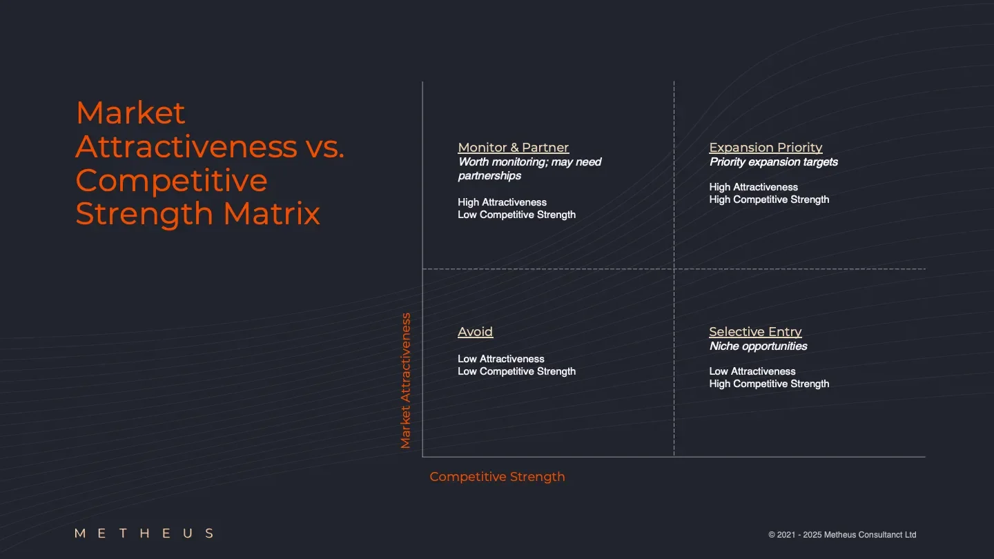 Low Attractiveness + High Competitive Strength → Niche opportunities; selective entry